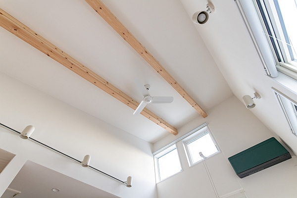 登り梁を見上げてみました。印象的なグリーンのエアコンは、ダイキンの「risora」。カラーバリエーションがたくさんあるのが特色で、K様が選んだカラーは「フォレストグリーン」です。