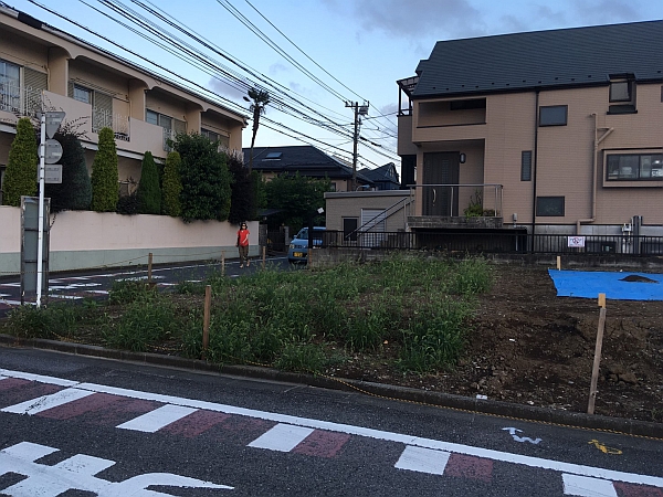 まずはK様邸の敷地を紹介します。大きな敷地に見えますが、ブルーシートが敷かれている場所はお隣の敷地で、ほぼ同時期に家づくりが始まります。K様邸の敷地は、下の写真の左側、北東の角地になります。