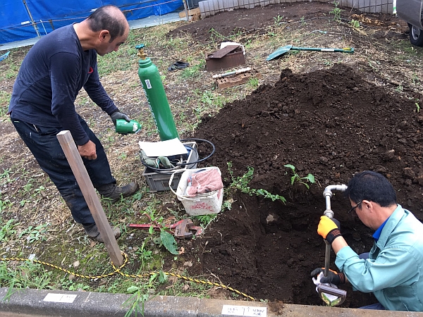 上の写真に写っているお二人は水道屋さんです。余談ですが、お客様といっしょに土地探しをする際、必ずこの水道屋さんにも現地を確認してもらっています。