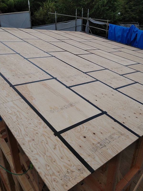 垂木の上から野地板(屋根の下地材)を施工した状態です。黒いテープは野地板のすき間を埋めるための気密テープです。気密性を高めるためにできることを頑張ってやっています。