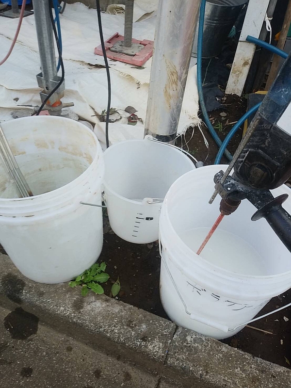屋根から下りると、職人さんがなにやら液体を調合しています。これはボラケアというホウ酸系の防蟻防腐剤です。この後、建物全体の土台部分に塗っていきます。