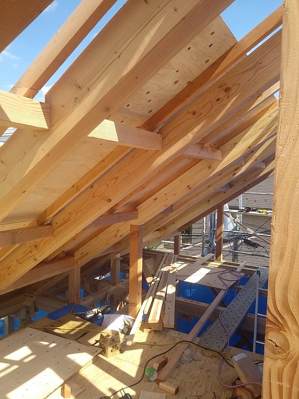 無事に屋根の下地材と天窓の施工が完了しました。この後、防水シートを施工して、その上から屋根材を敷き詰めていきます。まだまだ気が抜けない工事が続きます。