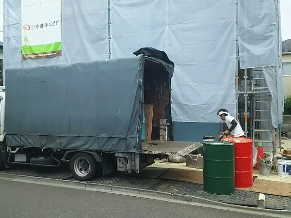 下の写真のトラックは断熱工事の職人さんのトラックです。これから断熱工事が始まります。緑と赤のドラム缶の中にモコフォーム(発泡ウレタンフォーム)の材料となる液体が入っていて、その液体を混ざ合わせることで、何十倍もの容積に発泡する仕組みです。