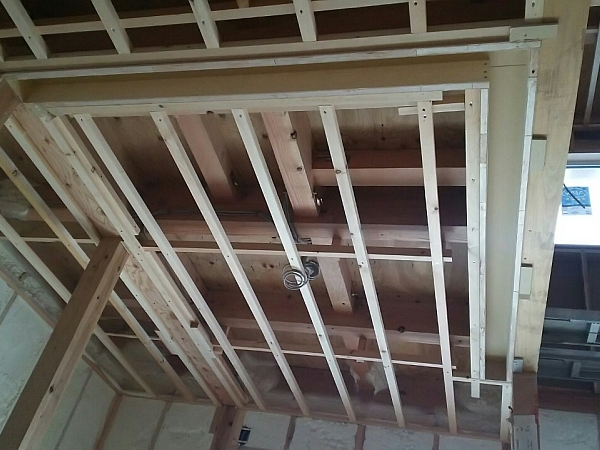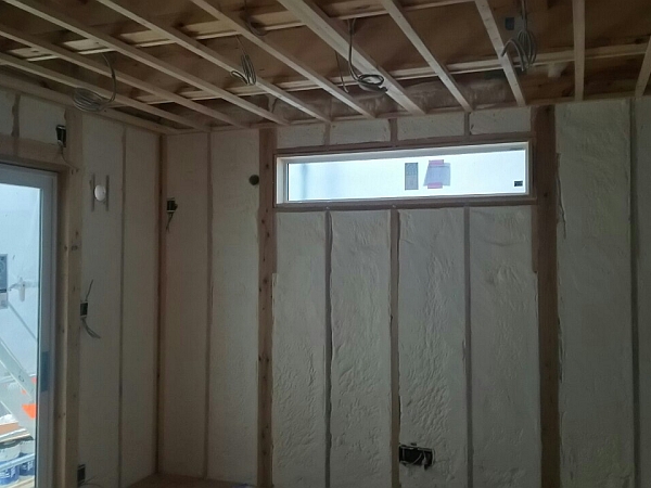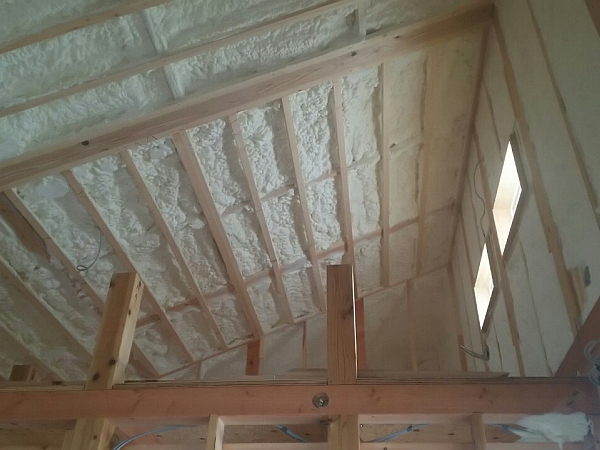 モコフォームの吹き付け作業中は中に入るのが憚(はばか)られます。なので、断熱工事完了の写真を貼っておきます。壁と勾配天井にモコフォームが密に入っています。