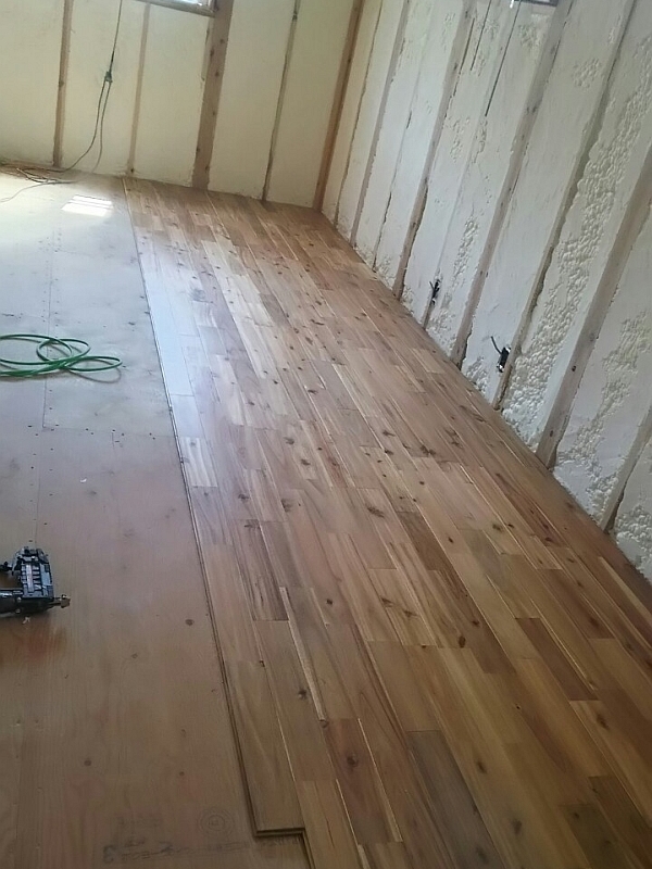 断熱工事が終わると、大工工事が一気に加速していきます。下の写真は、1階の床にオークの無垢材を貼っているところです。