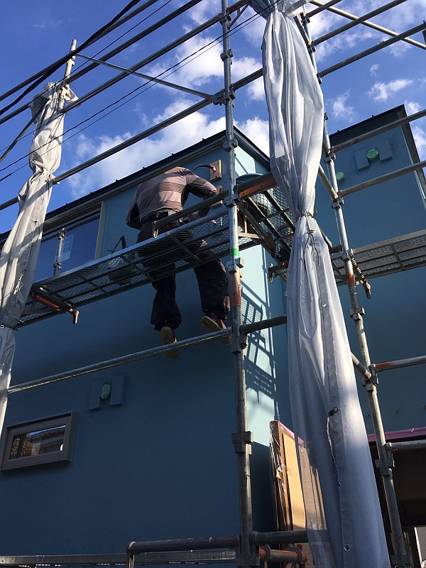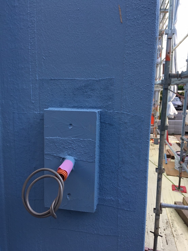 足場を上って職人さんの手元を覗くとこんな具合。電気配線が突き出す部分を丁寧に防水処理してくれていました。