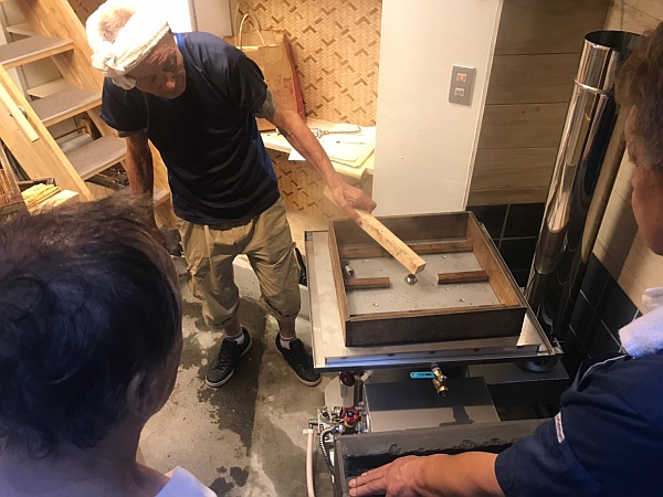 この写真は工事の最後の最後、まんじゅうの蒸し器を設置するボイラー屋さん。以前は石油ボイラーでしたが、これからはガスボイラーで調理を行います。給油の手間が省けるので楽になるはずです。