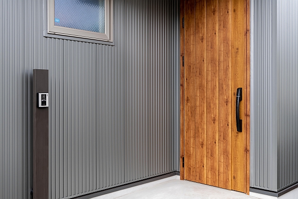 まずはA様邸のエントランス。撮影当日はあいにくの天候で、外観写真は残念なことにこれだけです(後日紹介の予定です)。外壁材はチタンメタリックのガルバリウム鋼板。玄関ドアはYKKの「ヴェナート」を採用しています。