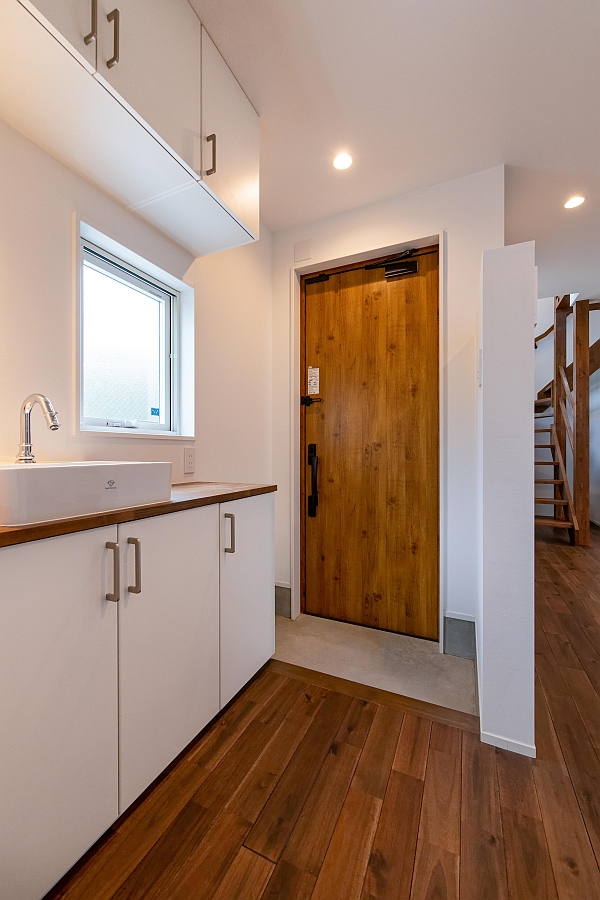 玄関ドアを室内から撮影しました。敷地を最大限に有効活用するために、A様邸の玄関はLDKの1画に、腰壁で空間を仕切る形で設けています。左に写っているのは、リクシルのシューズボックスを利用して造作した洗面台兼用シューズボックスです。