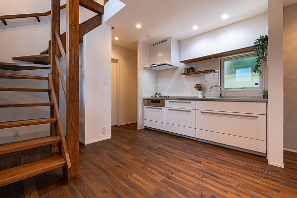 A様邸のキッチンとダイニングスペース。キッチンの奥には1つ洋室を設けています。