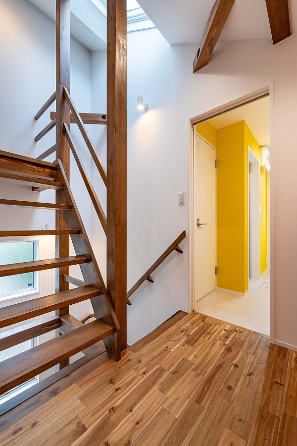オレンジの壁を背に、2階ホールを撮影しています。正面の階段を上がるとロフトです。2階の床材も1階と同じ無垢のアカシア材を使っています。