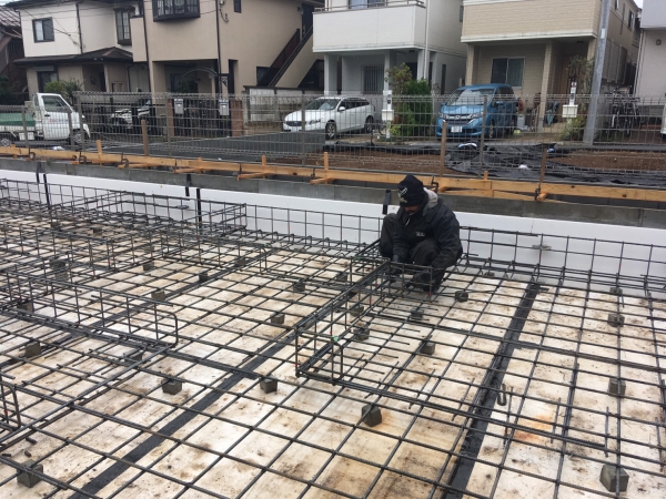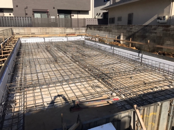 すき間なく敷き詰めたパフォームガード(基礎用の断熱材)の上から基礎の配筋を組んでいきます。