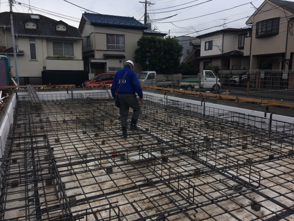 JIO(日本住宅保証機構)の検査員による配筋検査の様子です。鉄筋の太さ、鉄筋のピッチ(間隔)、鉄筋のつなぎ方などをかなり丁寧に見ていきます。