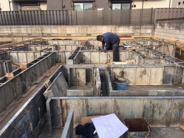 底面のコンクリートがしっかり固まったら、今度は立ち上がり部分を作っていきます。まずは立ち上がり部分の型枠を組んでいきます。
