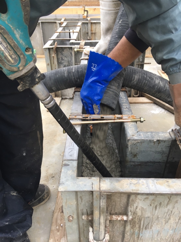 型枠の中にドバドバと、コンクリートを流し込んでいきます。これも2人一組での作業になります。
