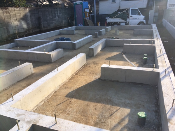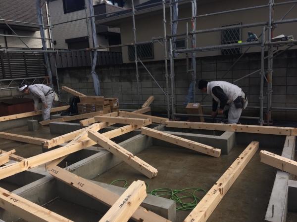 前回基礎工事の「基」の字ぐらいまでの様子を紹介したS様邸。今回は残りの「礎工事」の様子とその後の棟上げ(上棟)の様子をレポートしたいと思います。