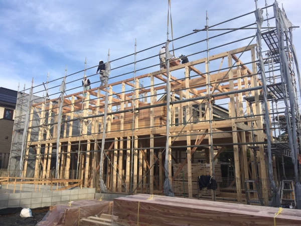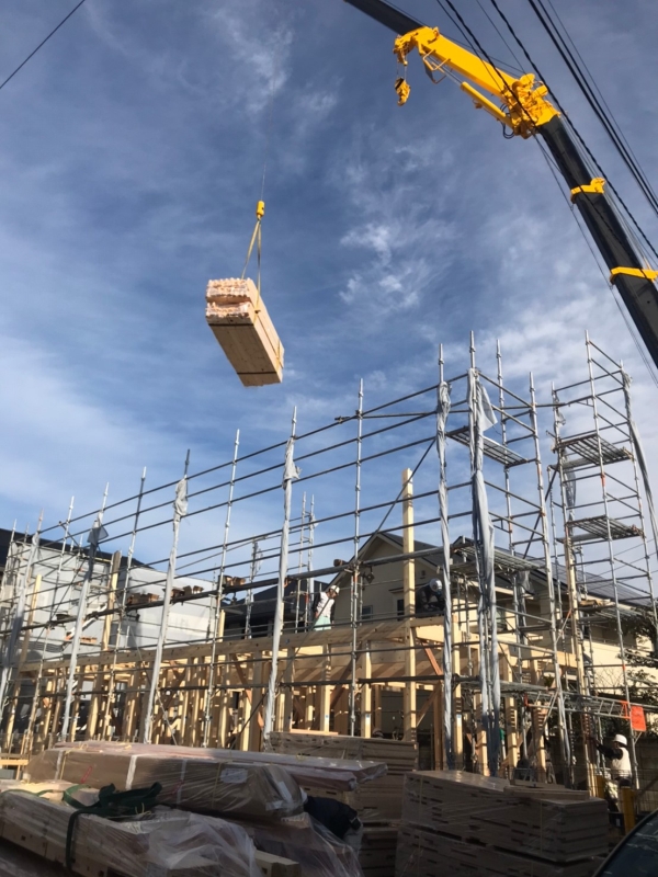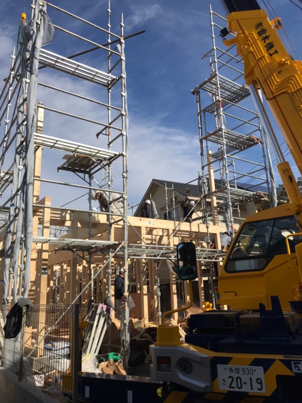 上棟が始まります。足場の鉄筋がTBSの「SASUKE」のファイナルステージのようになっていますが、これは構造材を吊り上げるクレーンの腕(ブームと言います)がぶつからないようにわざとこのようにしているのです。