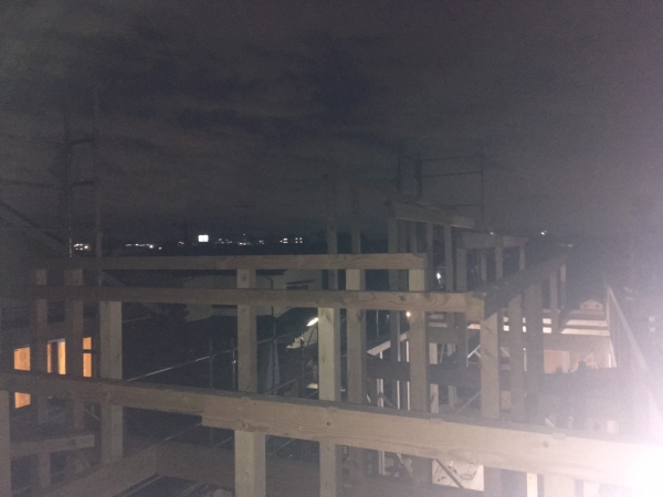 大きな家なので、2階の梁を組み上げた段階で日が暮れつつあります。