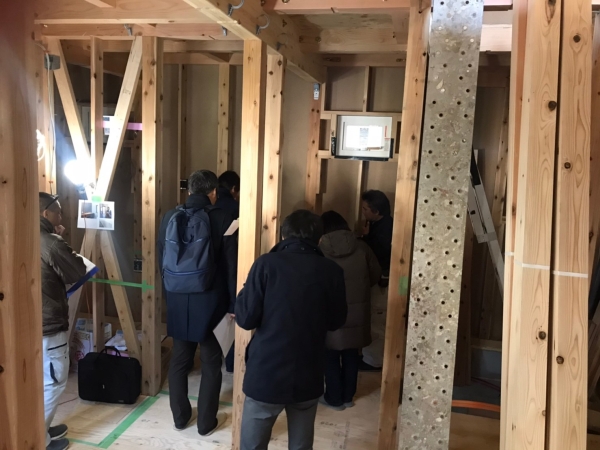 まずは上棟後に受けたJIO(日本住宅保証機構)の検査員の方による構造躯体検査の様子です。土台、柱、梁、接合金物などが正しく施工されているか、念入りにチェックをしていただきます。(もちろん合格でした)