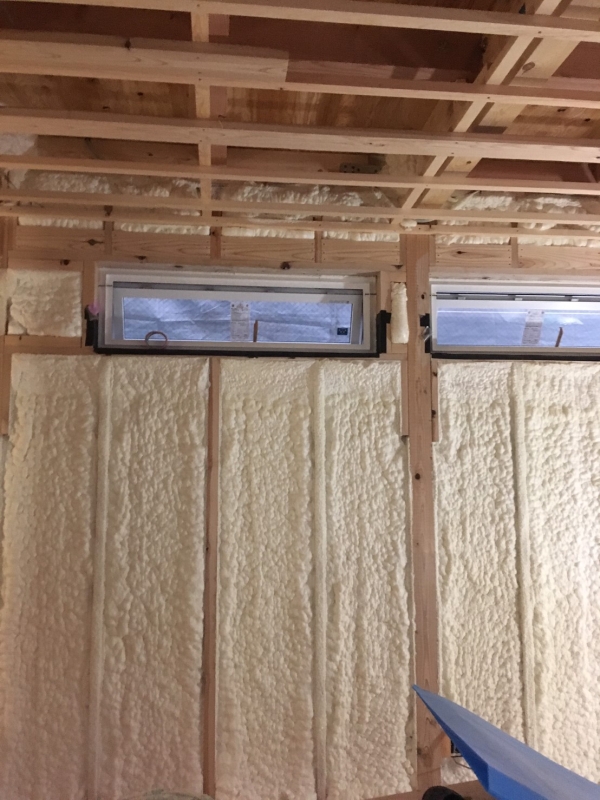現場打ち合わせ終わると、断熱工事が始まります。下の写真は、水で100倍に発泡するモコフォームという断熱材を吹き付けているところです。断熱工事専門の職人さんが施工します。
