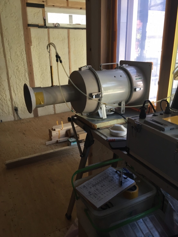 断熱工事が終わると気密測定試験を行います。このバズーカみたいな機械で家の中の空気を無理矢理外に排出し、その後どれぐらいの時間で家の中の気圧が元通りになるかを調べて、気密性能を測るしかけです。