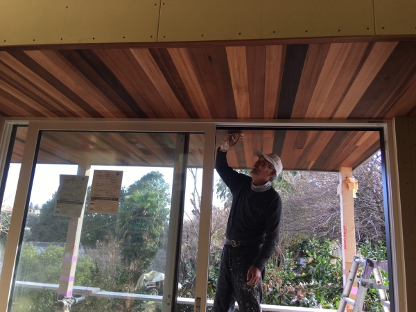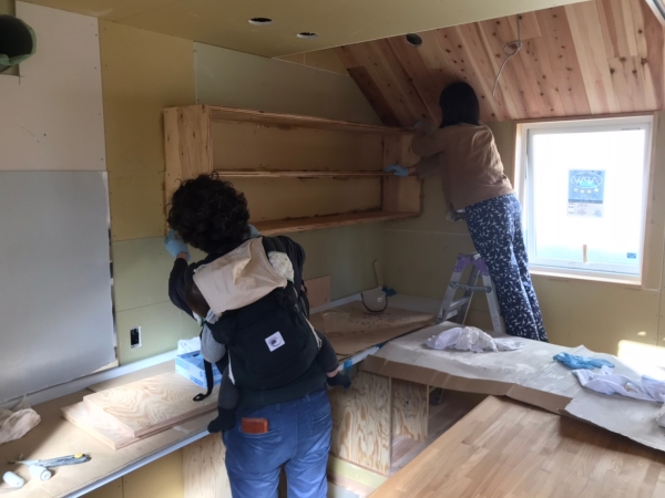 下の写真は、キッチン戸棚の塗装に勤(いそ)しむF様ご夫妻です。セルフビルドは建築コストの削減を目的にされるケースが多いですが、モノを作ることそれ自体が楽しい作業ですし、家への愛情も増すのでおすすめです。