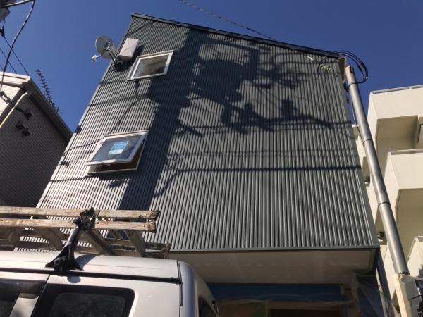 続いてF様邸の工事レポートです。まずは外観の写真から。この写真ではよくわからないですが、モスグリーンのガルバリウム鋼板を採用しています。