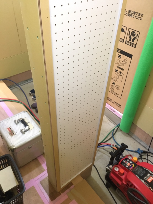 最後にもう一枚。玄関ホールの間仕切り壁に取り付けた有孔ボードです。帽子を掛けたり、カバンを掛けたり、カギを掛けたり、コートを掛けたり、大活躍する予定です。