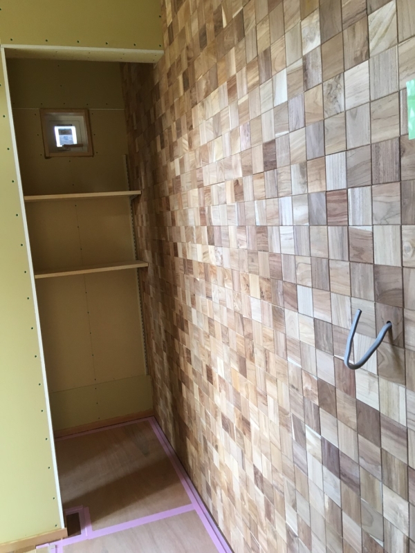 玄関ドア正面の古材を組み合わせたアクセントウォールも出来上がりつつあります。写真が暗くてイマイチですが、家全体ができあがって照明が当たると見違えるような印象になるはずです。
