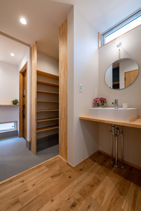 洗面室の隣には2帖ほどの広さの収納兼家事室があり、その先にはベランダに出る扉があります。洗濯して、干して、乾かして、収納するという一連の家事がほんの数メートルの移動でできるようになっています。