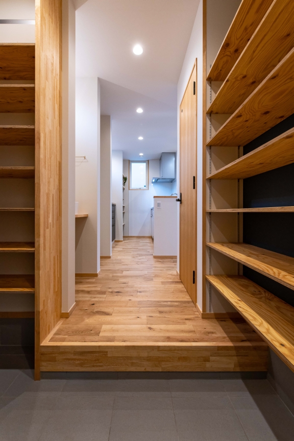 M様邸の玄関ホールは、リビング方向とキッチン方向の2方向から出入りできるようになっています。下の写真は玄関ドアから中に入って、すぐ左を見たところです。たっぷりのシューズクロークの先に手洗いスペース(左側ですが、この写真ではわかりづらいです)とトイレのドア(右側)があり、その奥はキッチンです。手洗いスペースがこちらにあるので、ご家族の基本的な動線はこちらになります。