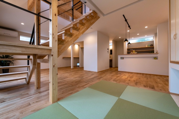 吹き抜け下のタタミスペースから見たM様邸のLDK。あぐらをかいて座るとちょうどこんなかんじの視界になります。
