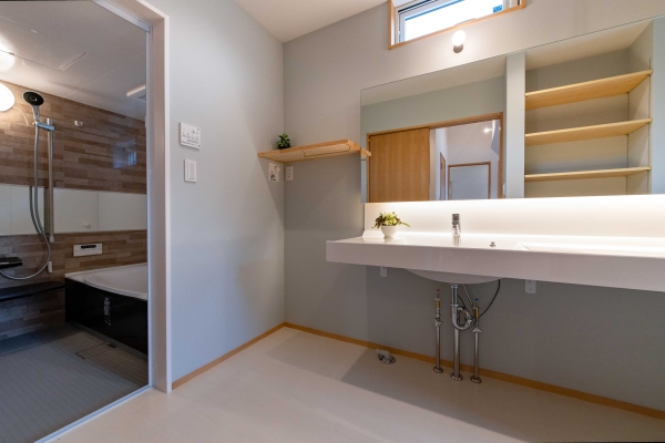 M様邸の洗面室とバスルームです。横長の特注の洗面台と大きなミラーがポイントです。