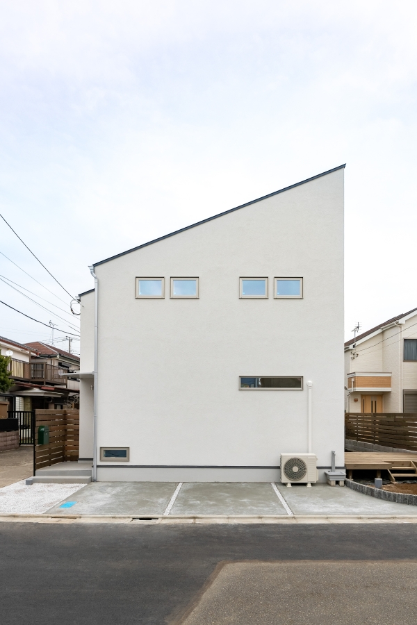 まずはM様邸の外観から。片流れのシンプルな屋根が特徴のモダンな外観です。西日とプライバシーを考慮して、道路側の窓は少なめに配置しています。