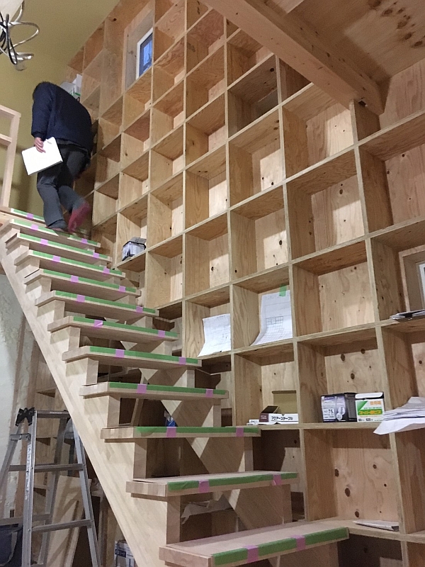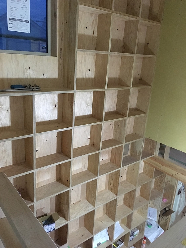 2階の階段横の壁に造作本棚ができあがりつつあります。これでもかなりの書籍が収納できると思うのですが…