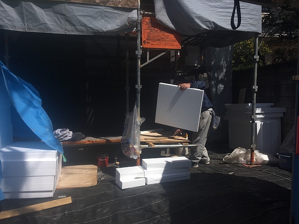 屋外では外断熱用の断熱材、EPSボードの施工が始まりました。下の写真で職人さんが持っている白いボードがEPSボードです。