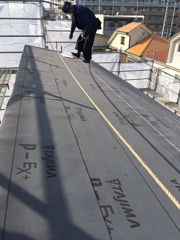 まずは、上棟の翌日の屋根工事の様子。アスファルトルーフィングという屋根用の防水シートを貼っています。