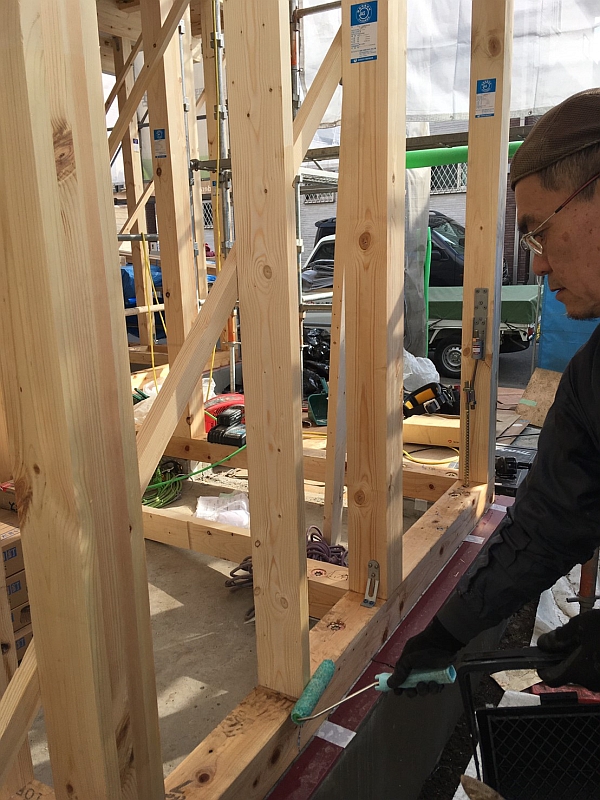 下では、職人さんが防蟻剤を丁寧に塗っています。小野寺工務店では「ボラケア」という人体に極めて安全な防蟻剤を使用しています。