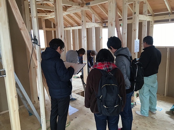 大工工事がある程度進んだ段階で、電気打ち合わせを行います。写真手前のお二人がO様ご夫妻です。その横でチェックシートになにやら書き込んでいるのは設計事務所のスタッフの方です。いろんな人のアイデアを積み上げて小野寺工務店の家はできあがっていきます。