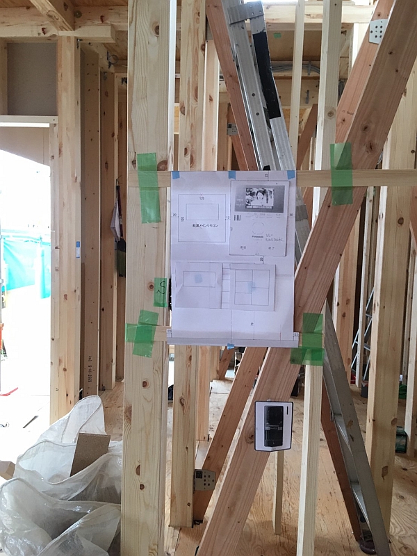 キッチンの位置も青いテープで表示しておきます。こうすることで、家事動線がイメージしやすくなり、「ここにもスイッチがほしい」とか、「ここのスイッチはもう少し手前がいい」とか、「掃除用のコンセントがここにもいる」といったご要望が出やすくなります。このタイミングでご要望をたくさん出していただくと、工事の手戻りがなく、また手遅れになることもなく、お客様も小野寺工務店もハッピーになります。