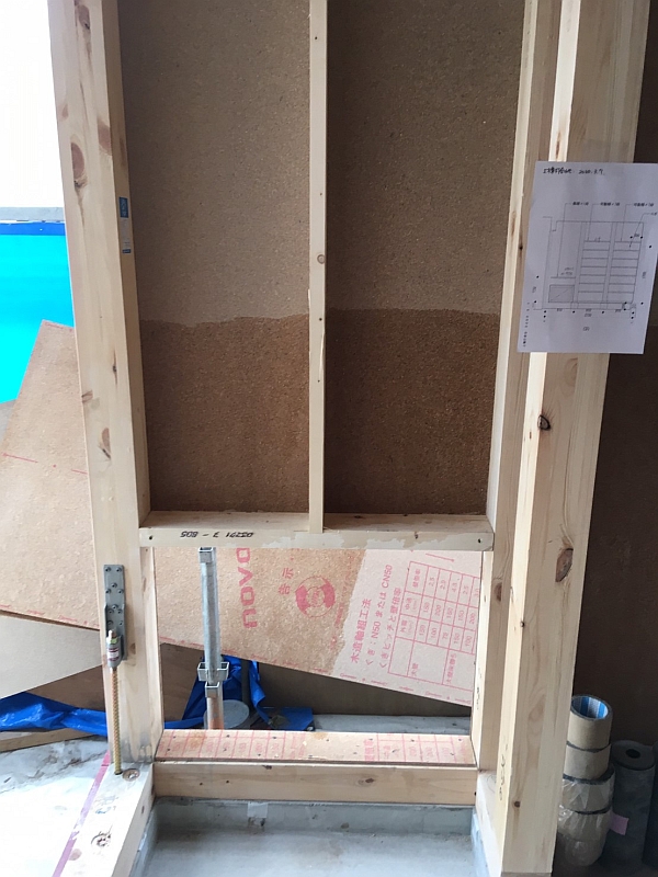 玄関のシューズクロークを造作する場所には、意匠図も貼り付けておきます。濡れているように見えるところは、直前に防蟻剤を塗った箇所です。