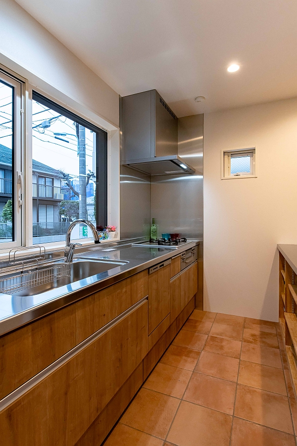 中庭に面したキッチンです。この写真では外が丸見えですが、この後ウッドフェンスができあがると、外からは見えなくなります。キッチンの床には名古屋モザイク製のテラコッタ風タイルを使用しています。ガスレンジの正面と横には奥様リクエストによりステンレス製のボードを貼っています。