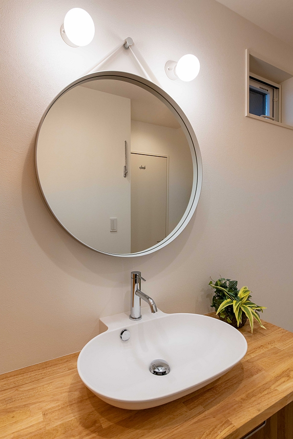 1階に戻って、ドイツ製のミラーとライトを設置した洗面台です。洗面ボウルはカクダイ社のものですが、ミラーとライトはK様からの支給品です。
