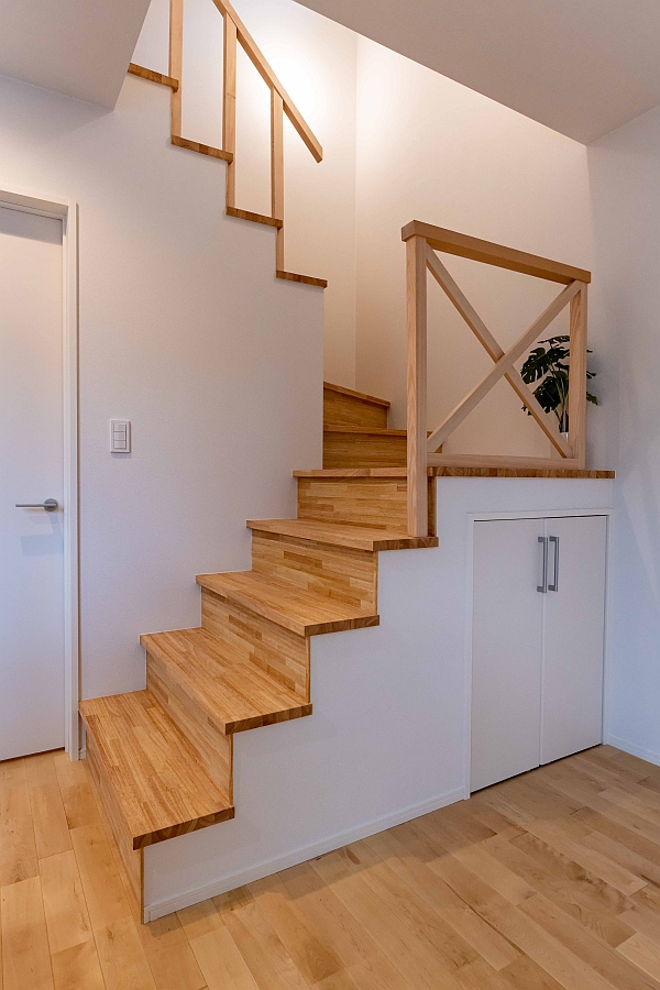 2階に上がります。階段には特注のアイアンの手すりを取り付ける予定ですが、納品がお引渡しの少し後になるので、とりあえず仮の木製手すりを付けています。階段下には収納を設けています。