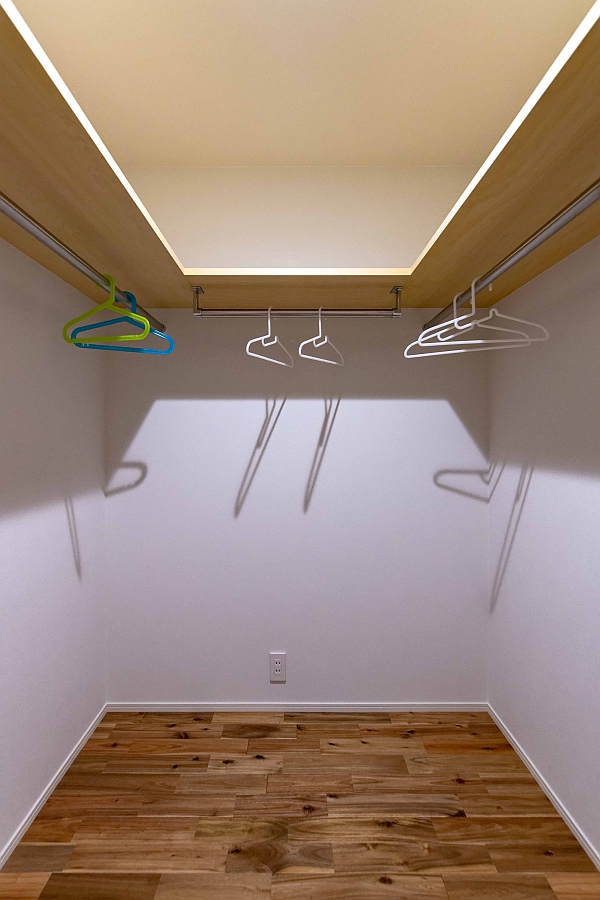 主寝室のウォークインクローゼットです。収納ボックスの数やレイアウトが、奥さまの頭の中で明確かつ完璧にイメージされていて、そのレイアウトに合わせて、奥行きや棚の高さをミリ単位で調整しています。