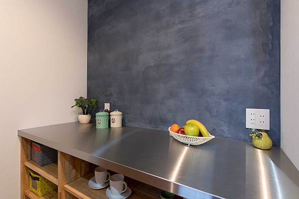 キッチンの背面カウンターです。カウンターはステンレス製、壁はモルタル仕上げです。プロの厨房っぽい仕上がりになりました。