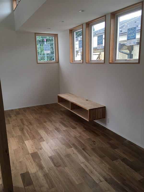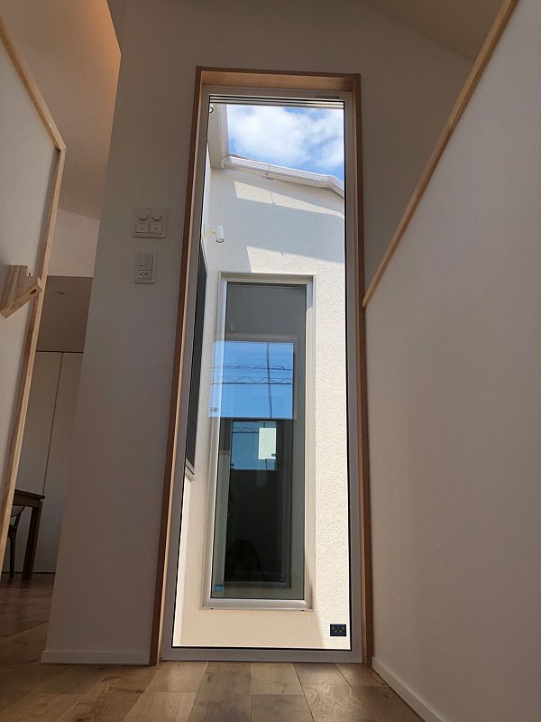 2階からはこのように見えます。床面から立ち上がる縦長のFIX窓を両サイドに配置しています。イロハモミジが成長すると、いずれ2階からも緑の植栽が見えるようになります。