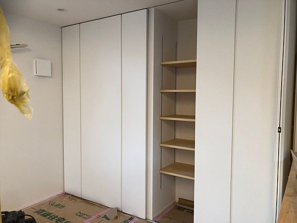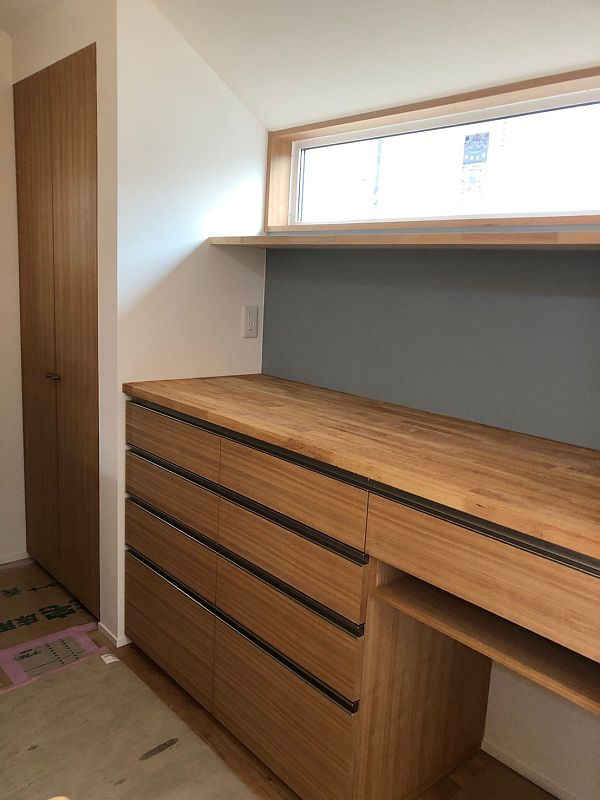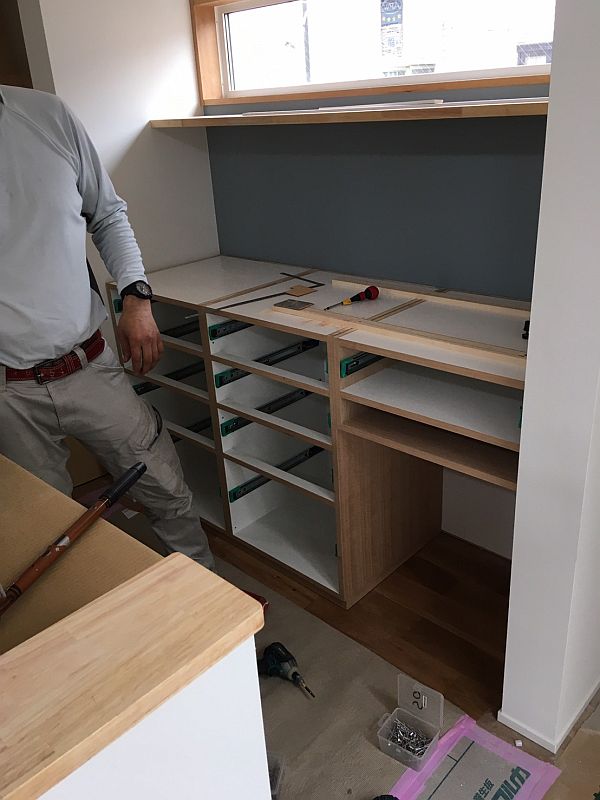 2つめは、キッチン背面の造作カウンターに設けたランチョンマット入れです。下の写真を見てください。「背面カウンター、ただいま造作中!」という写真ですが、右の列の上から2段目に設けた少し浅い棚、こちらが奥様ご要望のランチョンマット専用の収納スペースです。ちなみに左側と中央の引き出しの高さも、お持ちの食器に合わせて設計しています。