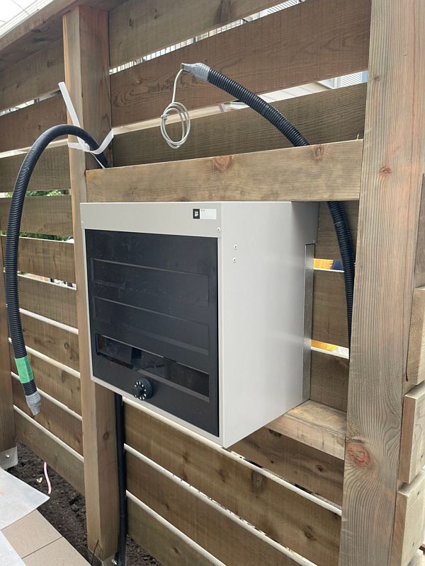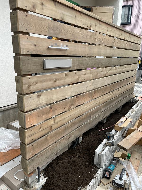 4つ目は、玄関前のウッドフェンスに設置した郵便受けです。郵便受けはそもそも、最終的な仕上げ方はともかく、内側にコンクリートブロックを積み上げて作った門柱に設置する仕様になっていて、強度の足りないウッドフェンスに取り付けることは、ほとんどありません。