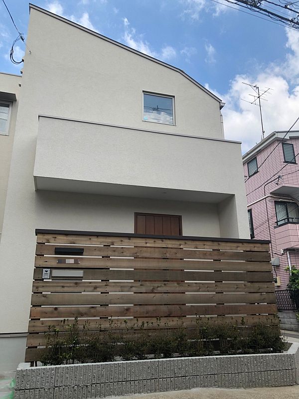 ドウダンツツジの植栽が終わり、完成したM様邸のウッドフェンスです。郵便受けのほか、インターフォンと表札灯も取り付けました。